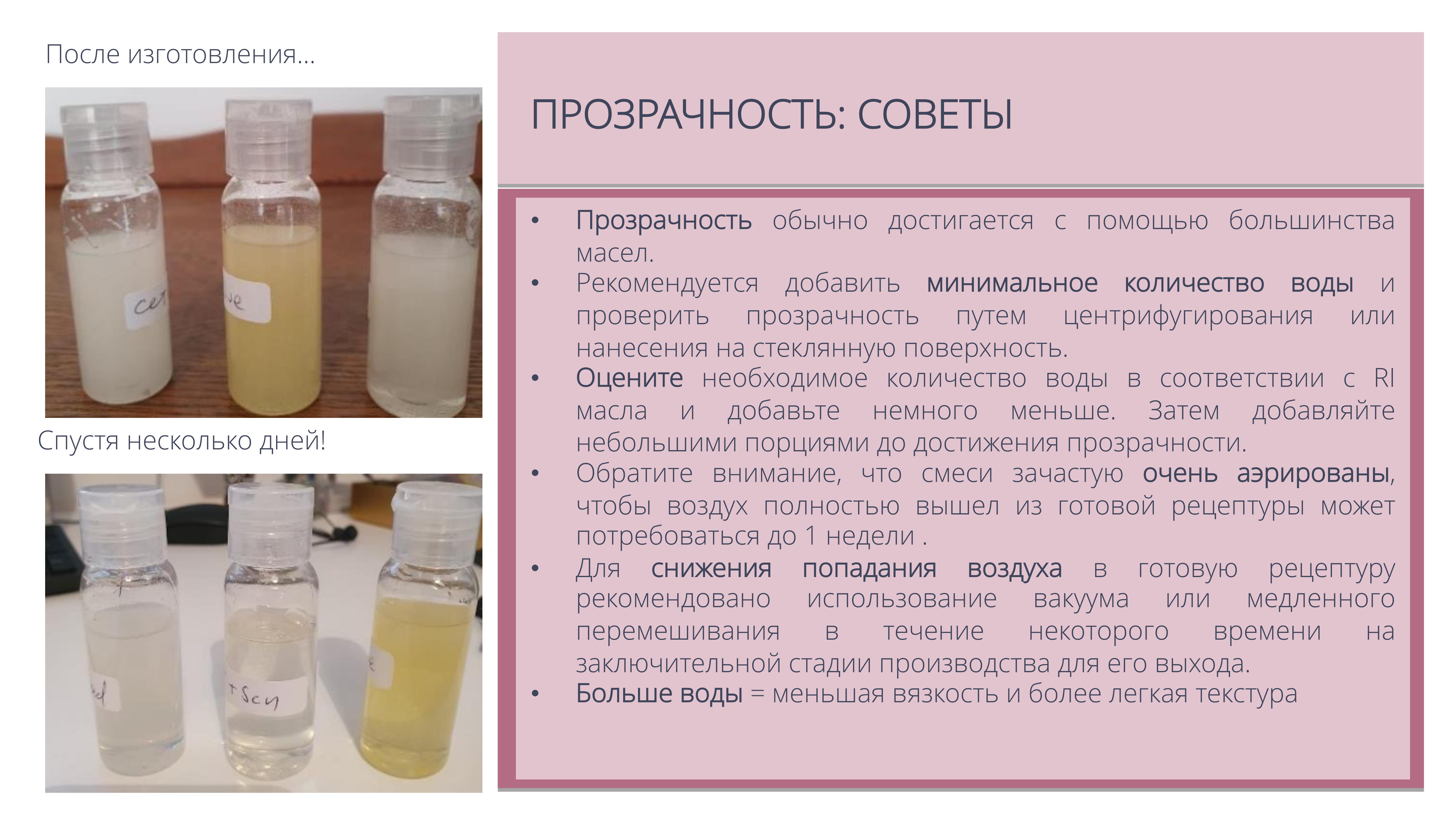 Позволяет создавать ультра актуальные прозрачные мицеллярные масла для очищения кожи и снятия макияжа, продукты для купания («молочные ванны»), гидрофильные масла для душа.